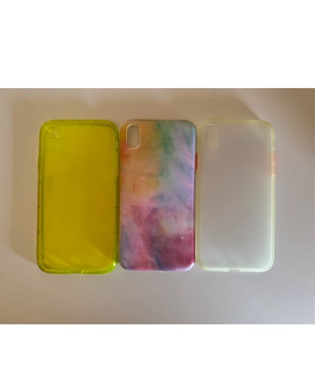 Set di tre cover per iPhone XR. - Cover gialla trasparente - Cover con fantasia effetto marmo colorato - Cover bianca traslucida