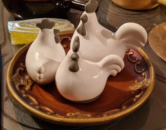 Set 3 gallinelle soprammobile in ceramica con piatto marrone. Nuovo.