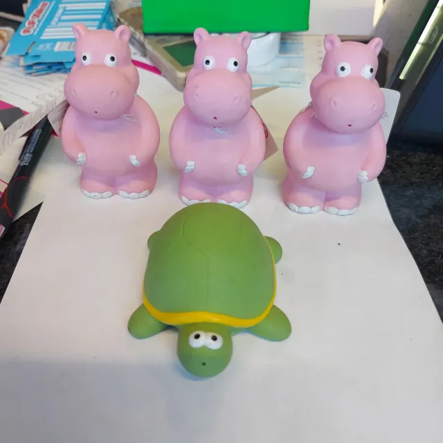Set di simpatici animaletti in gomma, perfetti per il bagnetto o per giocare. - Tre ippopotami rosa. - Una tartaruga verde con dettagli gialli.