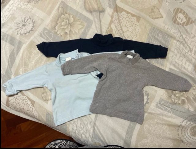 Set di tre magliette a collo alto per neonato. - Colore azzurro - Colore grigio - Colore nero