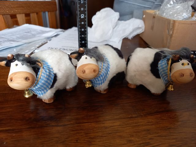 set 3 mucche terracotta e pelo sintetico, misure 9cm x altezza di 6 cm. possibilità di prendere 1 solo pezzo a euro 2,50