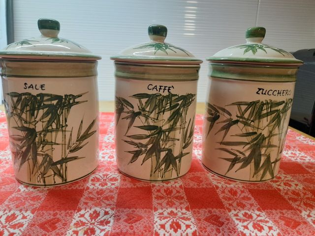 Dettagli del prodottoSET COMPOSTO 3 PEZZI BARATTOLI PER CAFFÈ, ZUCCHERO E SALE IN CERAMICA DECORATI CON MOTIVO PIANTE DIAMETRO 9,5 CM E ALTEZZA 13 CM SENZA COPERCHIO IN BUONE CONDIZIONI