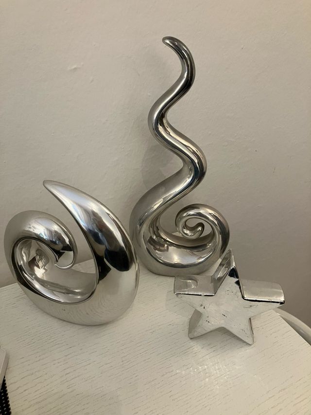 Dettagli del prodottoSet di tre sculture moderne in finitura argento lucido. Ideali per arredare con stile.