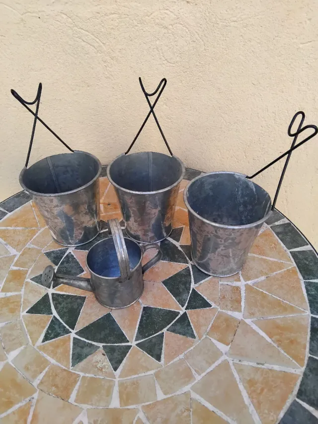 Set di tre vasetti in metallo con manici e un piccolo innaffiatoio. - Vasetti in metallo con manici. - Piccolo innaffiatoio in metallo.