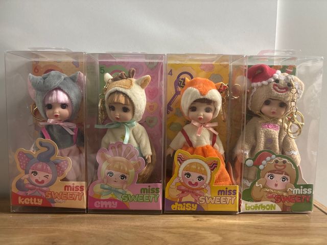 Dettagli del prodottoSet di 4 bambole Miss Sweety con simpatici costumi a tema animale e natalizio.