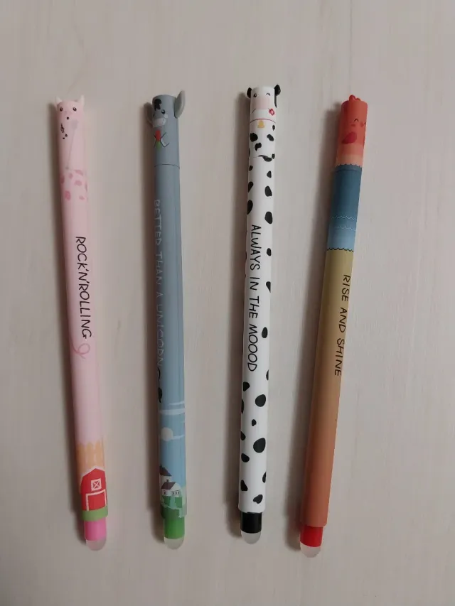 Dettagli del prodottoCarino set di 4 penne cancellabili con simpatici disegni a tema fattoria. Perfette per la scuola o l'ufficio.