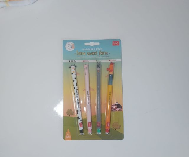 Dettagli del prodottoSet di 4 penne cancellabili Legami, tema Farm sweet farm Fattoria