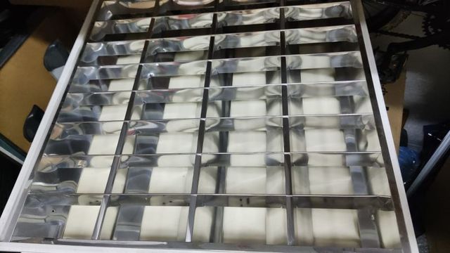 Dettagli del prodottoSet di quattro plafoniere per illuminazione di uffici o garage. Le lampade presentano una struttura in metallo lucido e pannelli diffusori.