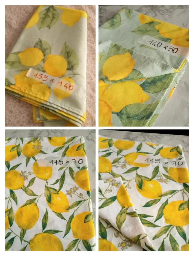 Dettagli del prodottoSet di 4 scampoli di tessuto con fantasia di limoni. Ideali per progetti creativi.