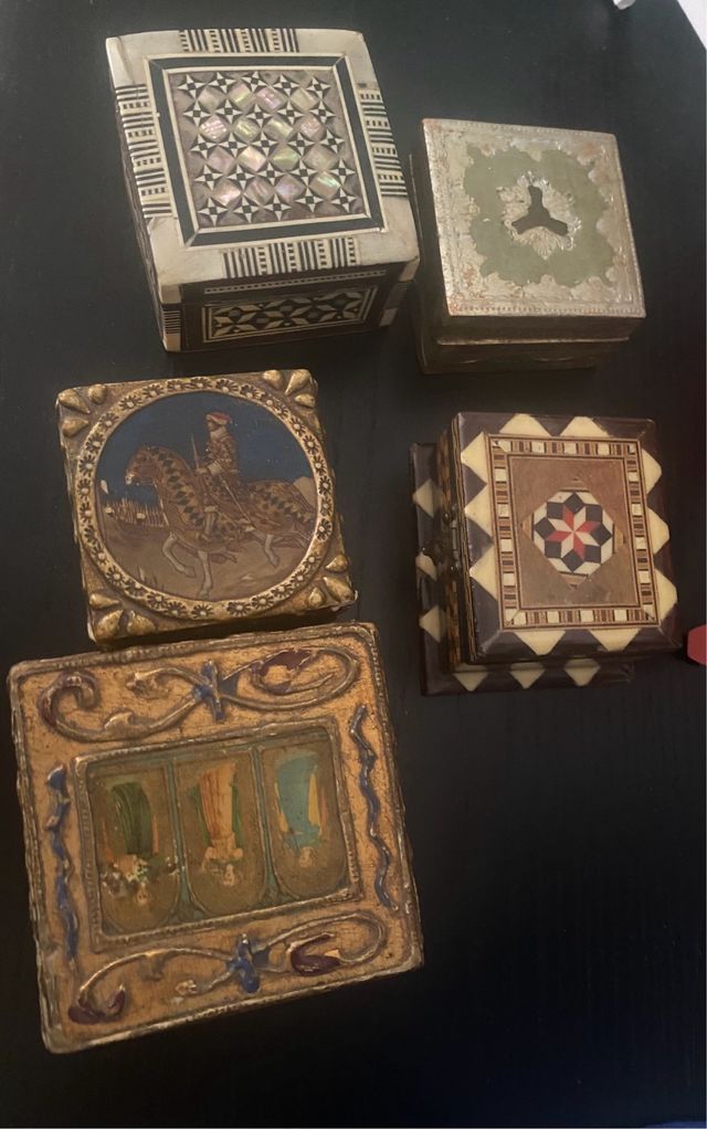 Dettagli del prodottoBellissimo set di quattro scatoline antiche, perfette per conservare piccoli oggetti o come elementi decorativi.