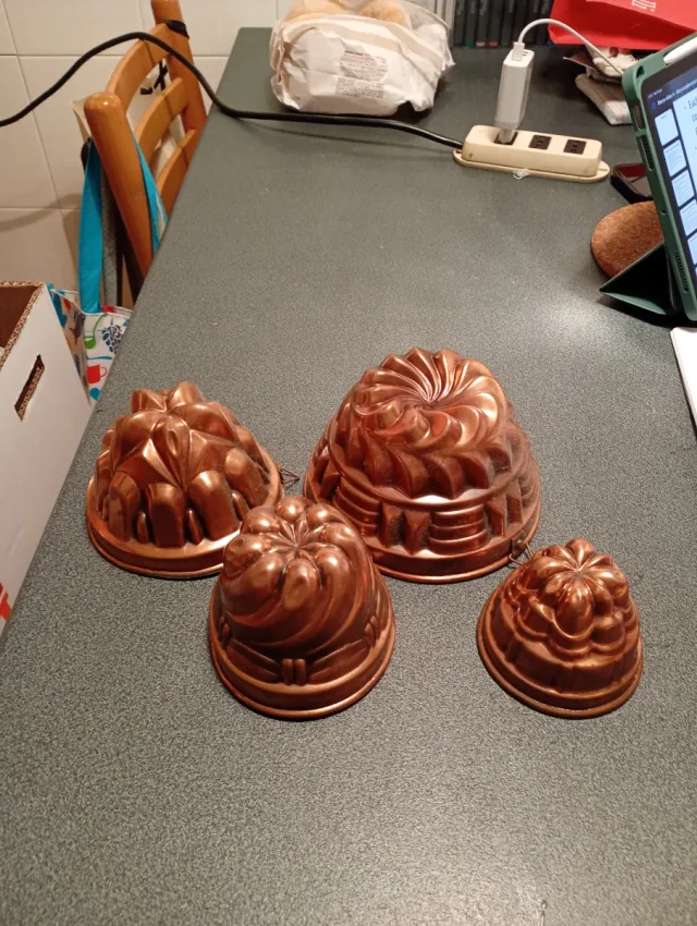 Set di quattro stampi decorativi in rame - Materiale: Rame - Diametro: tra 15 e 9 cm - Con ganci per appenderli
