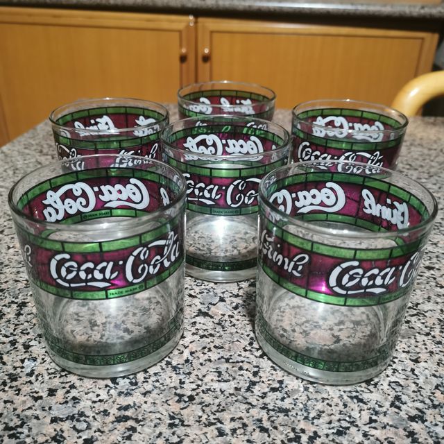 Set "vintage" di 6 bicchieri Coca Cola. Bicchieri in vetro, spessi e dal diametro di 8 cm circa.