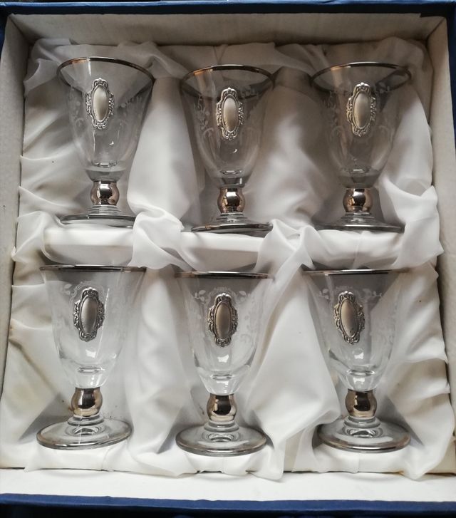 Dettagli del prodottoSet di 6 Bicchieri con decorazioni Argento, Lavorati a mano e realizzati con materiali di ottima qualità come da certificato di garanzia presente. La scatola che li contiene risulta rovinata e viene spedita solo per preservare l'incolumità dei bicchieri...