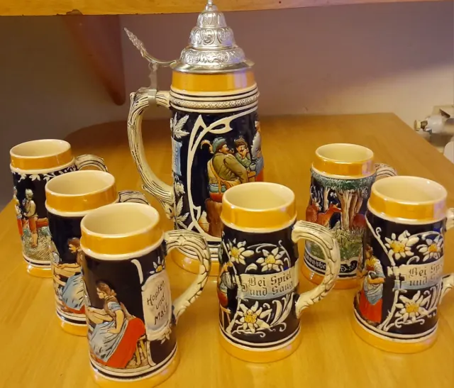 Dettagli del prodottoSet completo originale anni 60/70 made in Western Germany in gres smaltato: un boccale grande Mabkrug da 1 litro con coperchio in peltro (zinco) e 6 boccali piccoli da circa mezzo litro. Decorati a rilievo con le classiche scene bavaresi e tipiche scritte augurali e brindisi da birreria. In ottime condizioni hanno normali segni del tempo solo sul fondo e uno è un po' scolorito su un bordo