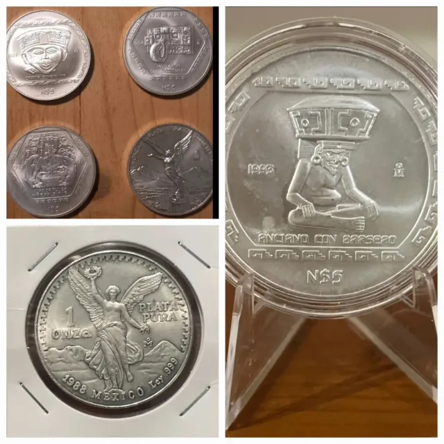 Set di 6 monete commemorative del Messico. - Monete in argento. - Dettagli storici e culturali messicani. - Valore nominale N$5.