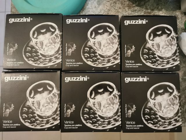 Dettagli del prodottoSet di 6 tazzine da caffè con piattini coordinati. Modello " Venice" del brand Guzzini ,nuove con scatolo originale , confezionate singolarmente (ogni tazzina+piattino ha la sua confezione).