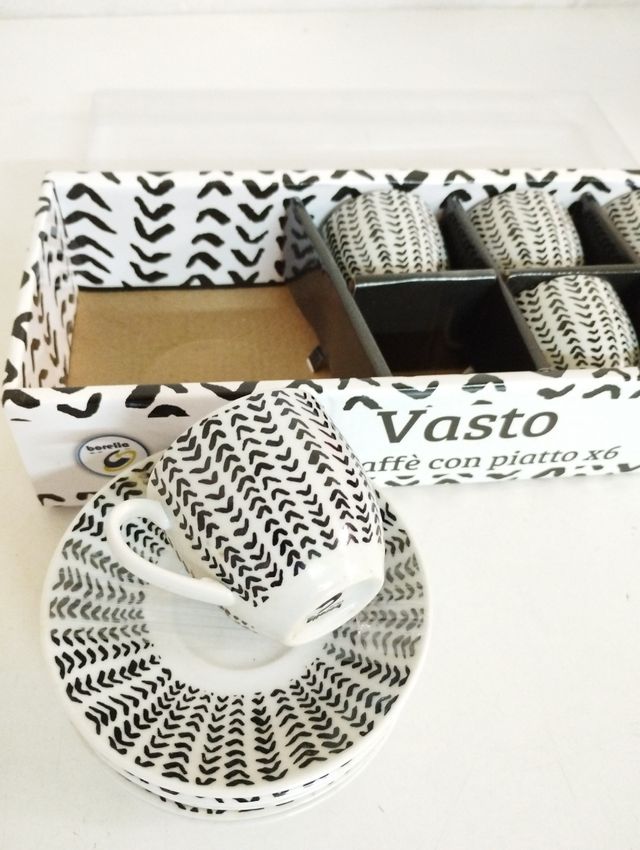 6 tazzine da caffè in porcellana decorata con 6 piattini, diametro della tazza cm 6 altezza cm 6 , diametro del piattino cm 11.
