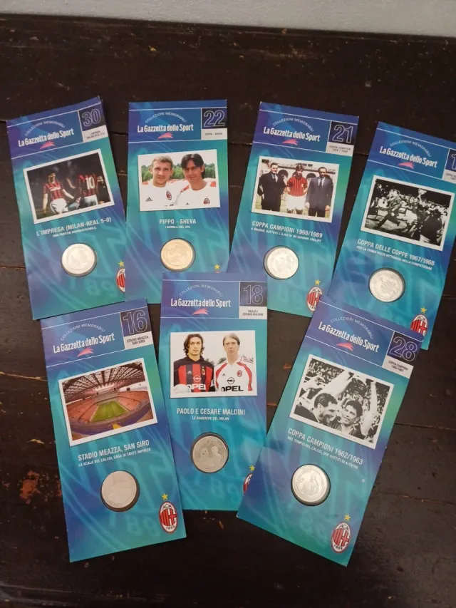 Dettagli del prodottoSet di 7 medaglie commemorative della Gazzetta dello Sport dedicate al Milan.