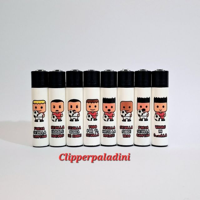 Dettagli del prodottoSet di 8 accendini Clipper con grafica a tema calcistico dedicata al Sevilla.