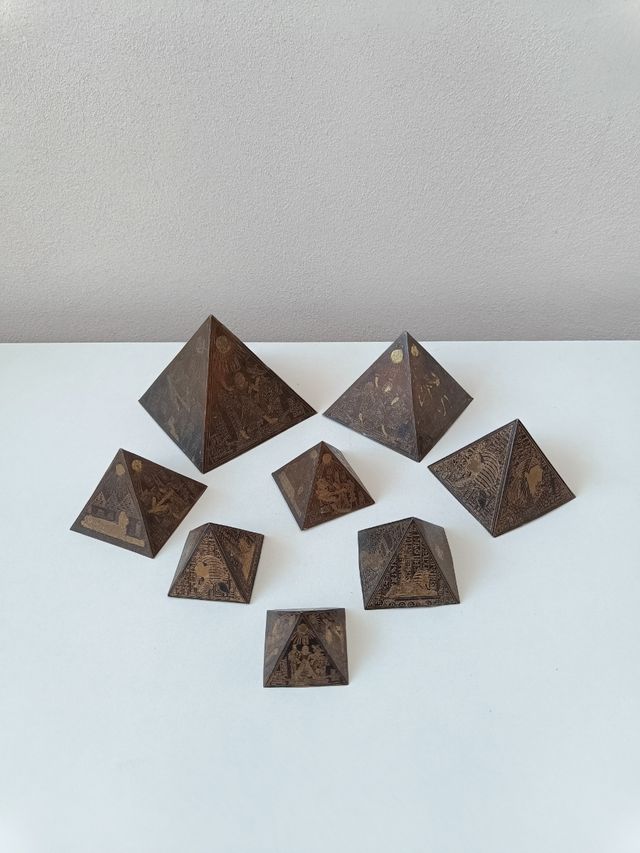 Dettagli del prodottoBellissimo set di 8 piccole piramidi egizie, perfette per collezionisti o amanti dell'Egitto. Sono realizzate in metallo scuro con dettagli dorati.