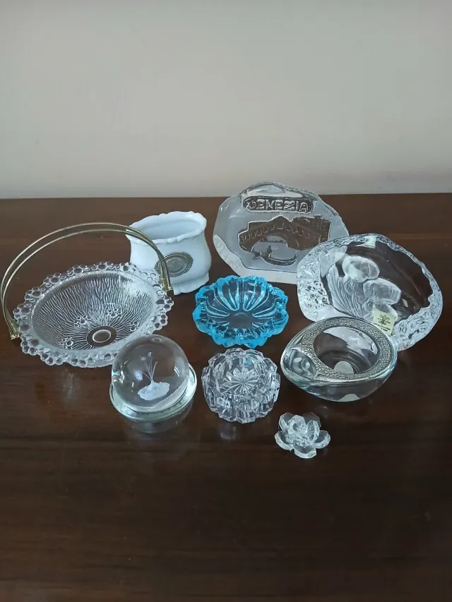 Dettagli del prodottoBellissimo set di 9 elementi vintage in cristallo, vetro e argento, perfetti per aggiungere un tocco di eleganza alla tua casa.