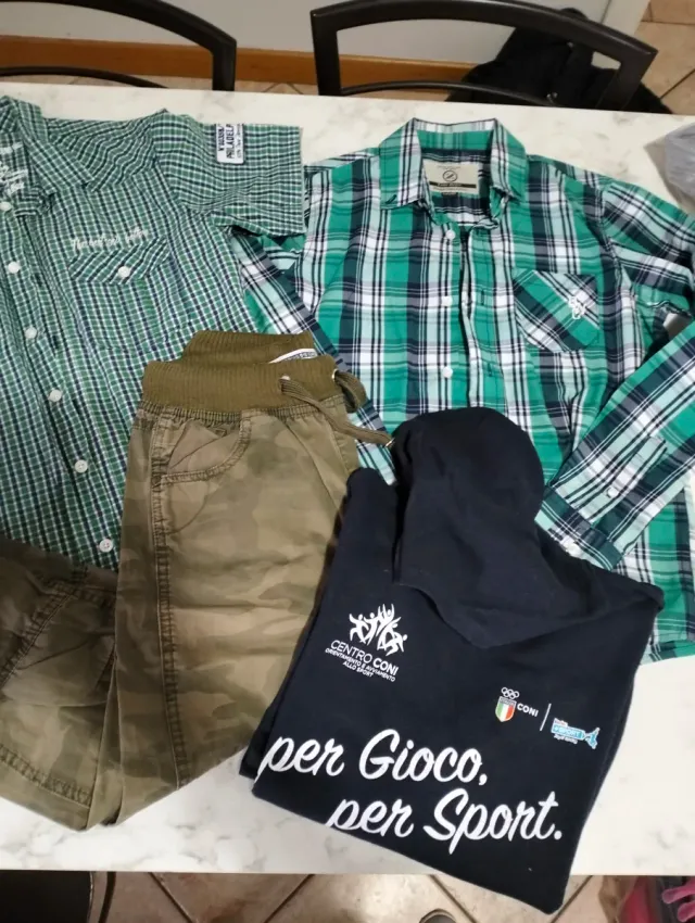 Set di abbigliamento per ragazzo composto da 4 capi. - Due camicie a quadri verdi. - Un pantalone mimetico. - Una felpa con cappuccio nera.
