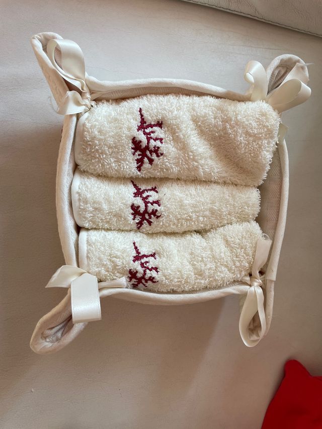 Set 3 asciugamani + cestino porta asciugamani. Colore: bianco con decorazione conchiglia e coralli Il prodotto è NUOVO