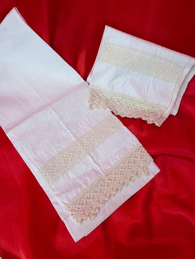 Set asciugamani composto da due grandi in lino, fatti a mano, bordura in uncinetto. Misure 64x102 Circa