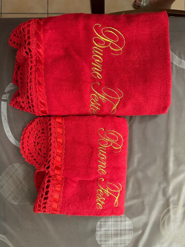 Dettagli del prodottoCoppia di asciugamani ospiti 100% cotone, viso (mis. 50x100), bidet (mis. 40x60) con merletto e impuntura con scritta dorata “buone feste” Misure del prodotto