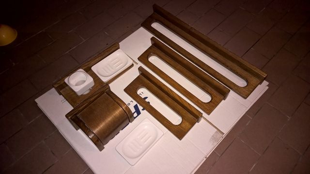 set in legno x bagno: porta saponette, porta spazzolini,porta asciugamani , porta carta