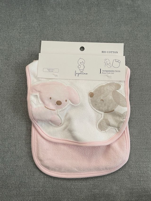 Articolo nuovo: 1bavaglino + 1asciugamano per neonati Colori rosa e bianco 100% cotone