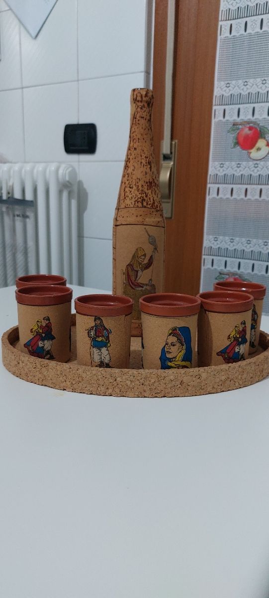 bicchieri bottiglia e vassoio terracotta e sughero. imperfezioni come prodotto artigianale.