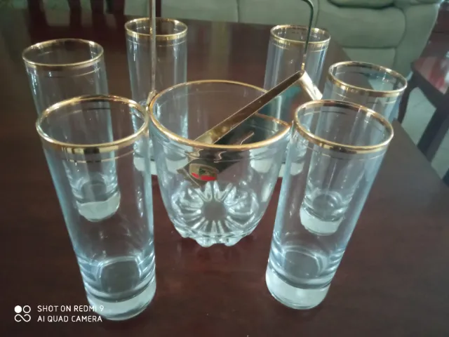 Elegante set di 6 bicchieri con finitura dorata e porta ghiaccio con utensili