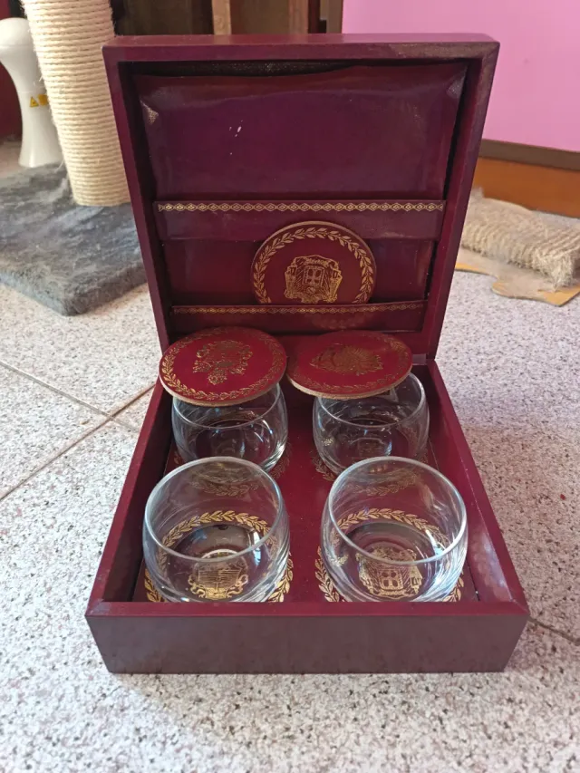 Dettagli del prodottoElegante set da liquore con bicchieri e sottobicchieri.