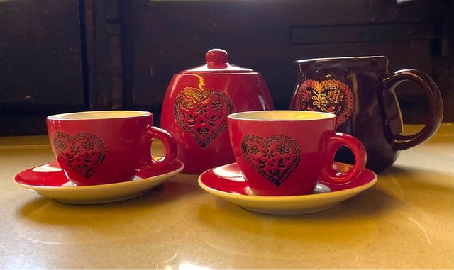 Set da caffè: comprende due tazzine con piattino, zuccheriera e lattiera, come nuovo mai usato.