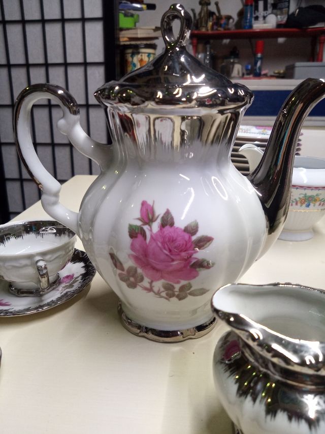 Dettagli del prodottoset composto da caffetteria, lattiera due tazzine caffè con piattino e due piatti porta dolci, in ceramica Bavaria, rose e bagno d'argento.