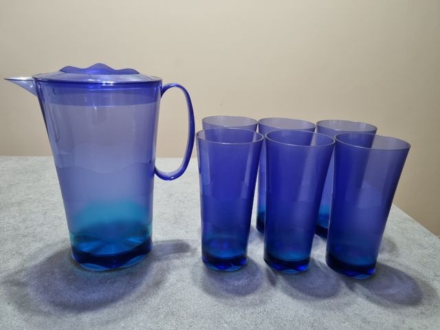 Set 1 Caraffa da 2 litri e 6 Bicchieri da 475ml. Colore: Blu. Condizione: come nuovo. Marca: Tupperware