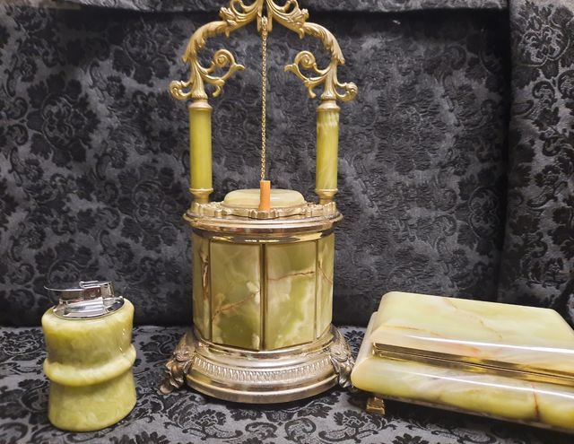 Dettagli del prodottoElegante set composto da carillon, portasigarette e scatola, realizzati in onice verde con dettagli dorati.