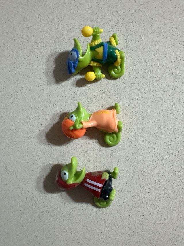 Tre simpatici personaggi dei Carletto Sofficini Findus. Brasile, india e perù - Personaggi in plastica verde. - Dettagli colorati.