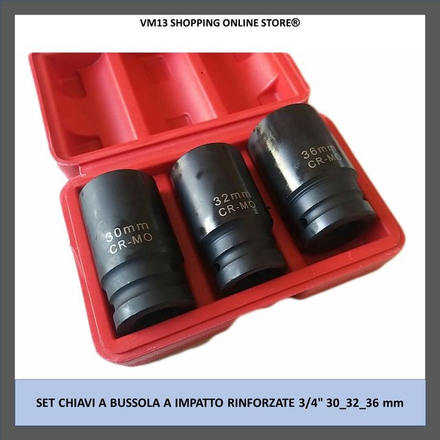 Dettagli del prodottoSet composto da 3 bussole millerighe a impatto con attacco da 3/4" per pistola avvitatore, contenute in una comoda custodia in plastica rigida.
