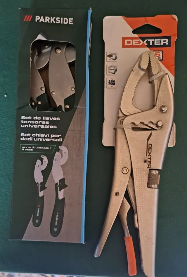 Set di chiavi universali Parkside e pinza autobloccante Dexter. - Set Parkside con 2 chiavi universali. - Pinza Dexter da 250 mm.