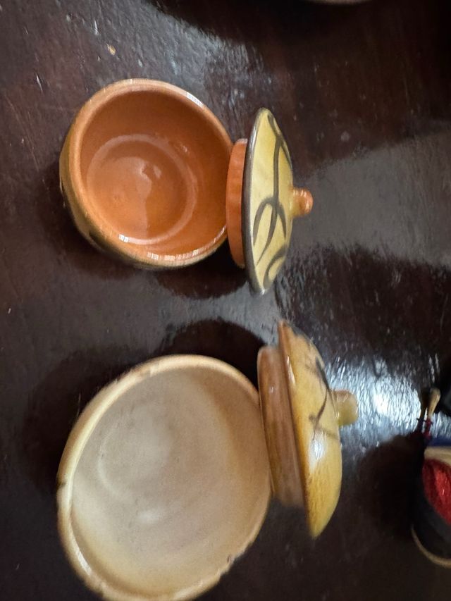 Dettagli del prodottoSet di piccole ciotole in ceramica con coperchi decorati.