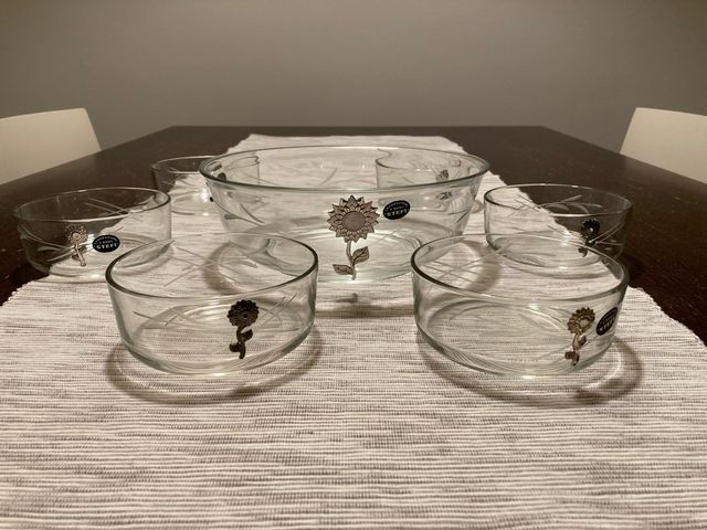 Elegante set di ciotole in vetro con decorazione floreale.