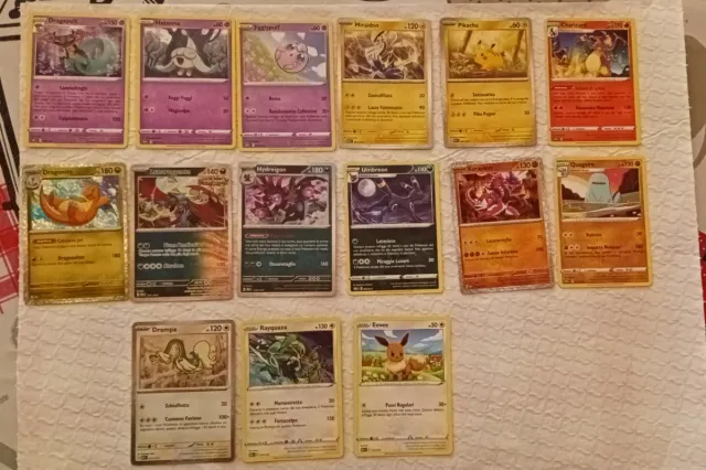 sette di esse sono olografiche (Pikachu, Miraidon, Koraidon, Hydreigon, Lunaruggente, Dragonite e Drampa).