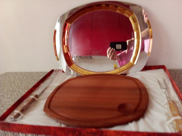 Composto da: vassoio acciaio e oro, tagliere in legno massiccio con scanalature per appoggiare perfettamente il vassoio, forchettone e coltello.