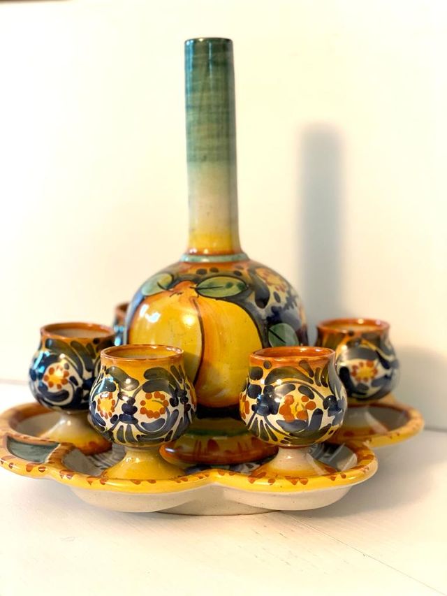 Dettagli del prodottoVendo set costituito da un piatto con 6 bicchierini e una bottiglia ad ampolla come da foto.