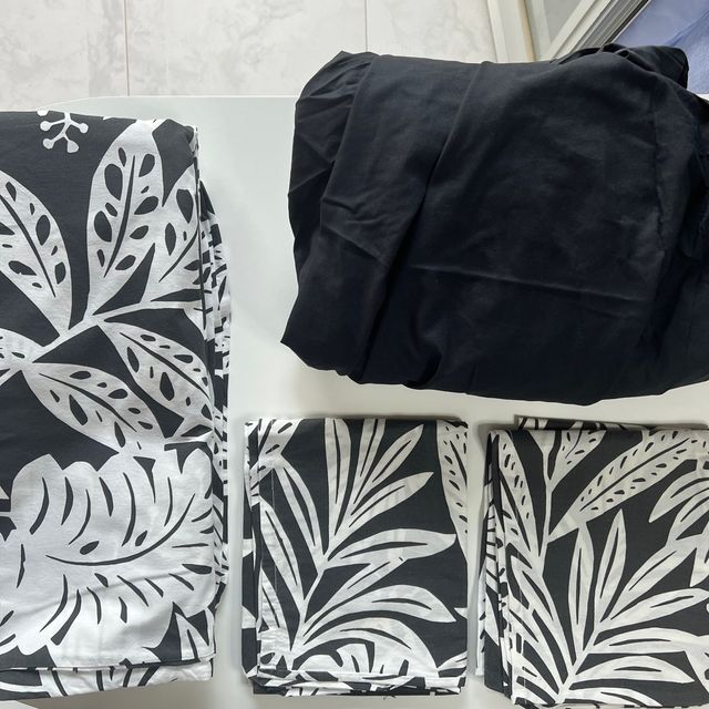 Dettagli del prodottoSet copripiumino (bianco/nero), lenzuolo sotto (nero), 2 federe cuscini (bianco/nero) Ikea. Bottoni automatici nascosti nel copripiumino tengono fermo il piumino. Lenzuolo sotto con angoli. 100% cotone.