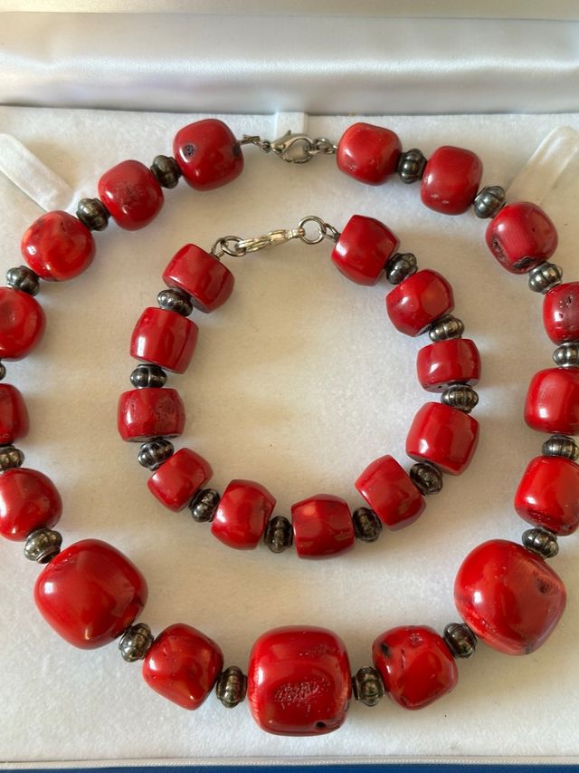 Dettagli del prodottoElegante set vintage composto da collana e bracciale realizzati con autentico corallo bambù rosso.