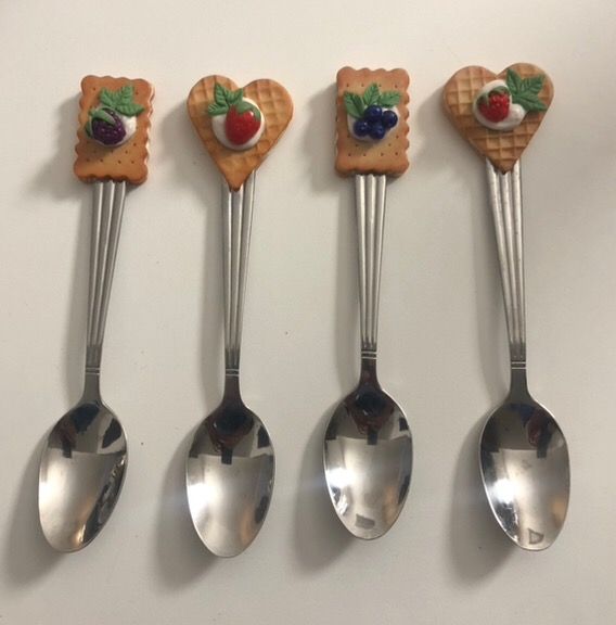 Set di 4 cucchiaini da gelato con differenti decorazioni artigianali in pasta fimo Mai usati