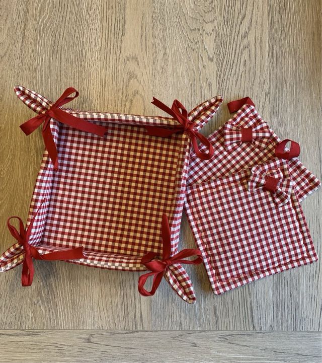 Pratico ed utile cestino di stoffa, imbottito con gommapiuma, creato con 8 laccetti posti ai lati per facilitare la chiusura. Coppia di presine realizzate con una imbottitura ignifuga.